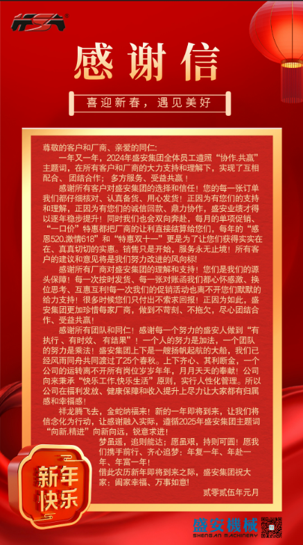 祥龍騰飛去,金蛇納福來!新的一年即將到來,讓我們將信念化為行動(dòng),讓感謝融入實(shí)際,遵循2025年盛安集團(tuán)主題詞“向新.精進(jìn)”向新向遠(yuǎn),銳意求進(jìn)!
